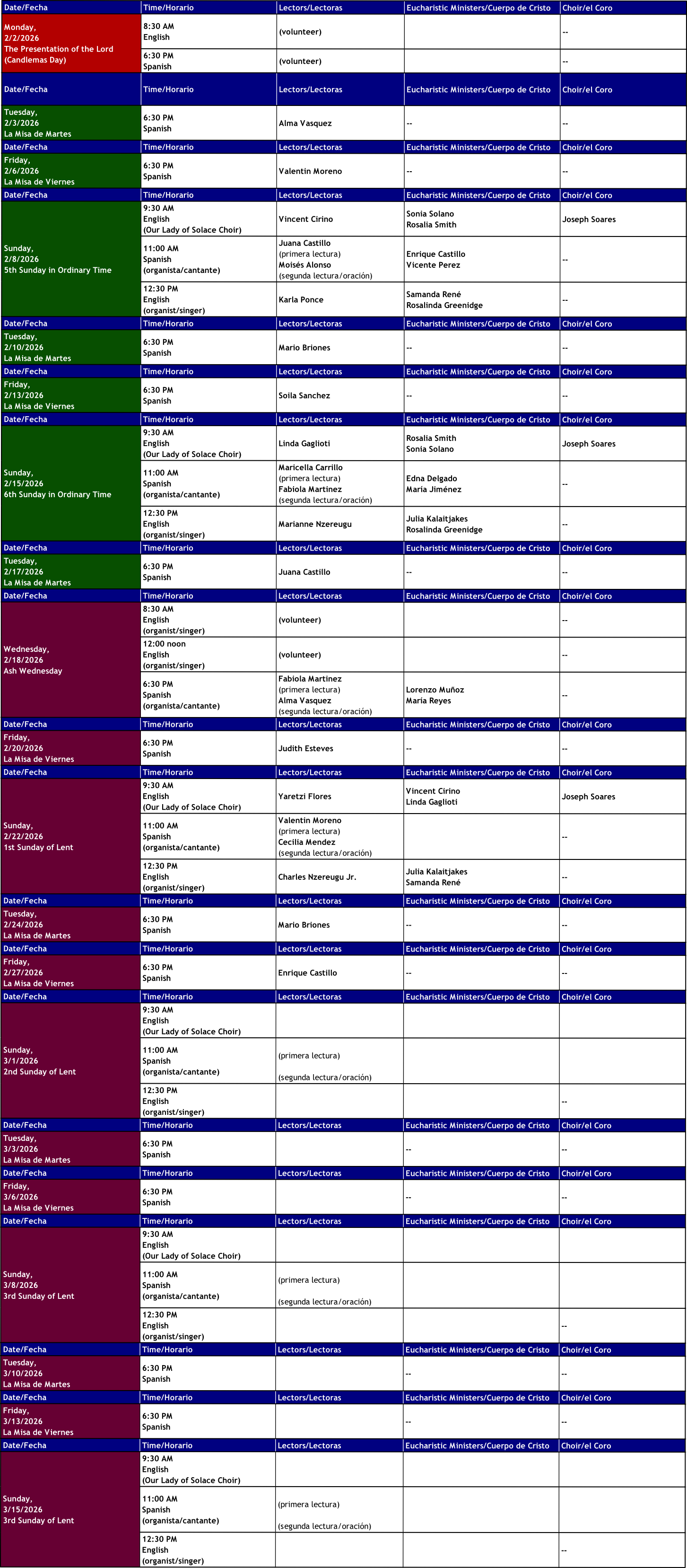 Our 126th year of serving the people of God in Coney Island Schedule of Lectors and Extraordinary Ministers of Communion February 2026